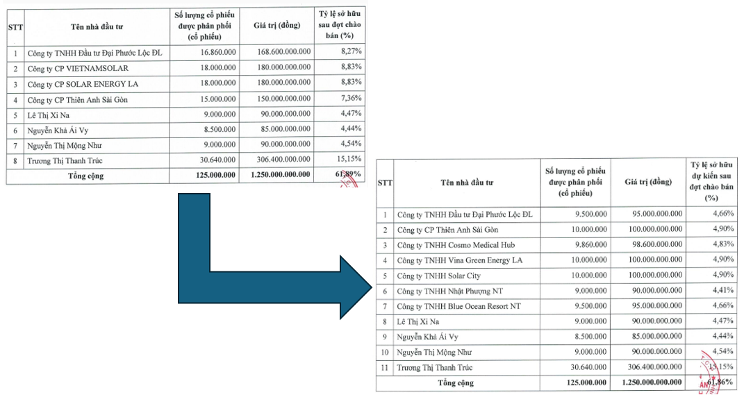 Đáng chú ý, ban đầu theo Nghị quyết HĐQT thông qua triển khai phương án vào cuối tháng 7 vừa qua, danh sách được phân phối cổ phiếu chỉ là 8 nhà đầu tư chuyên nghiệp. So sánh giữa danh sách mới và cũ, dễ thấy toàn bộ sự thay đổi đều đến từ nhóm nhà đầu tư tổ chức, mà ở đó ghi nhận dấu ấn lớn của Tập đoàn Hoàn Cầu.