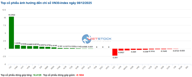 | Top 10 cổ phiếu tác động mạnh tới VN-Index phiên 08/12/2025 (tính theo điểm) | ||