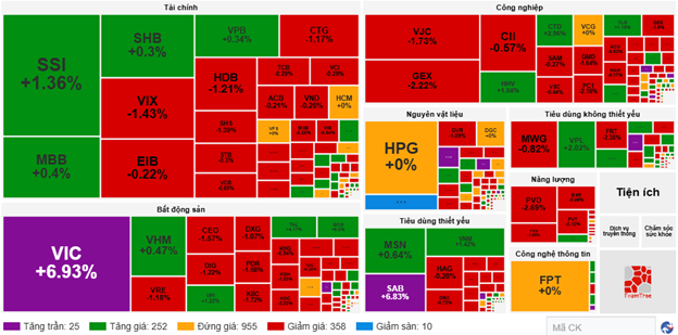 VN-Index mở cửa phiên chiều với áp lực bán xuất hiện khiến cho đà tăng của chỉ số bị thu hẹp nhưng bên mua nhanh chóng hỗ trợ vào cuối phiên giúp VN-Index giữ vững sắc xanh và đóng cửa tăng khá tích cực. Về mức độ ảnh hưởng, VIC, VHM, SAB và VPL là những mã có ảnh hưởng tích cực nhất đến VN-Index với hơn 15.1 điểm tăng. Ở chiều ngược lại, LPB, TCB, VCB và CTG là những mã vẫn chịu áp lực bán và lấy đi hơn 3.4 điểm từ chỉ số chung.