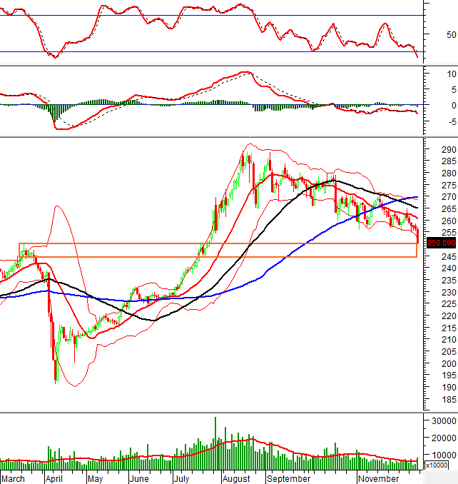 Thêm vào đó, chỉ số tiếp tục bám dải dưới (Lower Band) của Bollinger Bands và đang kiểm tra lại đỉnh cũ tháng 03/2025 (tương đương vùng 243-250 điểm) đã bị phá vỡ trước đó.