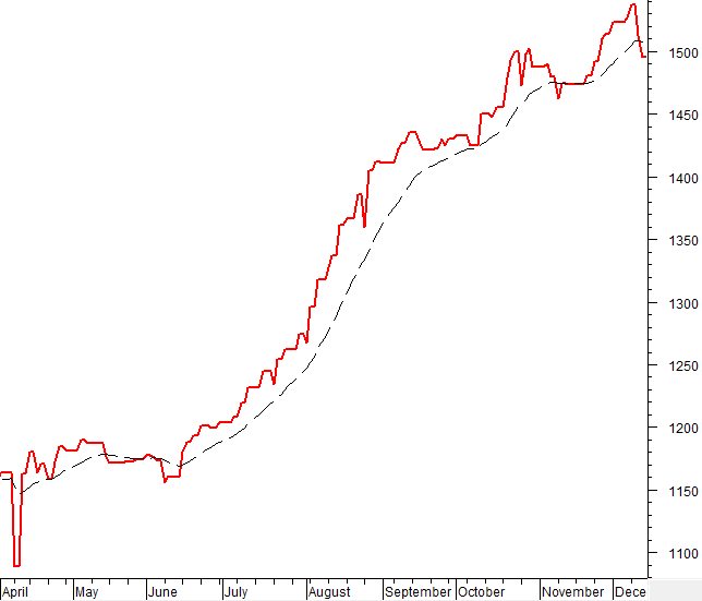 Trong phiên giao dịch ngày 12/12/2025, HNX-Index tiếp tục giảm điểm phiên thứ 6 liên tiếp đồng thời xuất hiện mẫu hình nến thân dài kèm theo khối lượng vượt mức trung bình 20 phiên cho thấy tâm lý bi quan của nhà đầu tư vẫn còn.