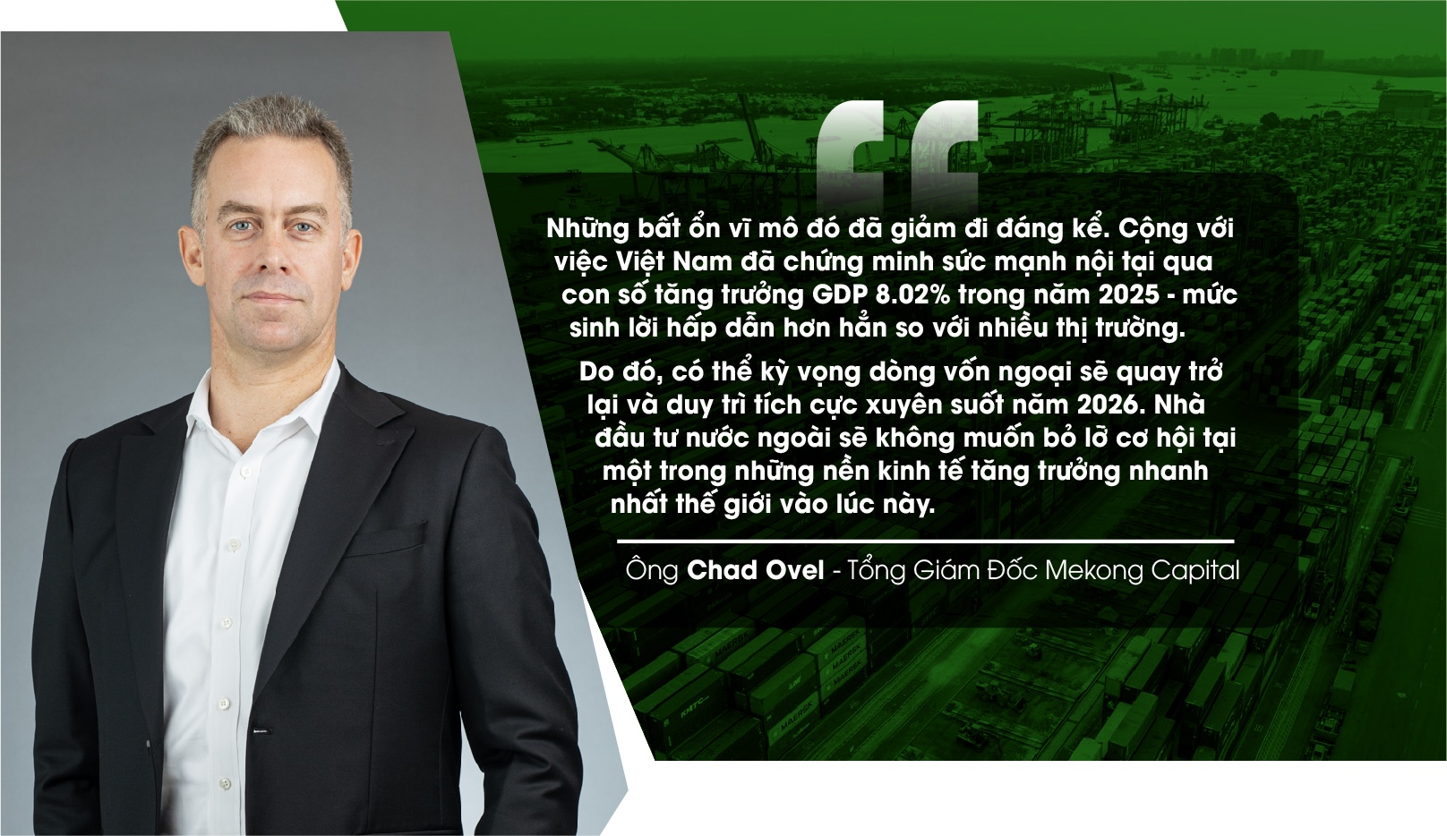 Trao đổi về triển vọng kinh tế vĩ mô và thị trường chứng khoán, ông Chad Ovel - Tổng Giám đốc Mekong Capital - đã vẽ nên bức tranh lạc quan nhưng không kém phần thận trọng cho năm 2026. Không chỉ phục hồi, năm 2026 được kỳ vọng bứt phá dựa trên những nền tảng vững chắc từ đầu tư công, chính sách tiền tệ linh hoạt và sự trở lại mạnh mẽ của dòng vốn quốc tế.
