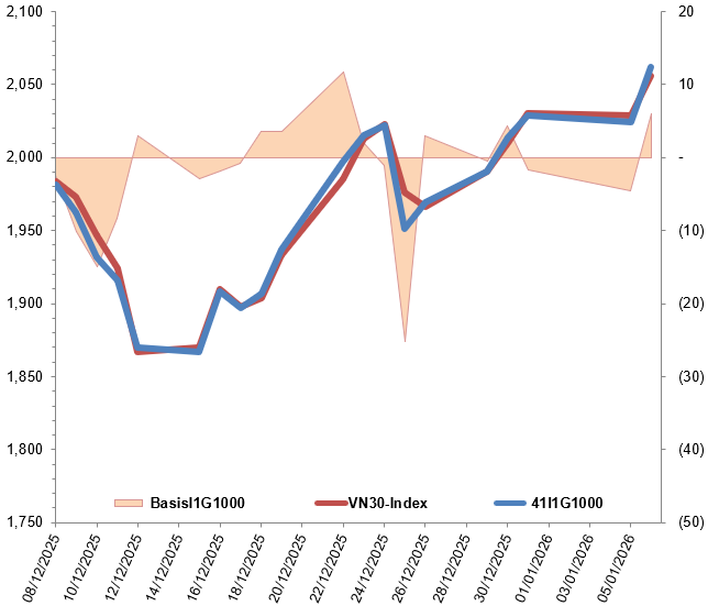 Các hợp đồng tương lai VN30 đồng loạt tăng điểm trong phiên giao dịch ngày 06/01/2026. Cụ thể, 41I1G1000 (I1G1000) tăng 1.87%, đạt 2,062 điểm; 41I1G2000 (I1G2000) tăng 1.88%, đạt 2,058 điểm; hợp đồng 41I1G3000 (I1G3000) tăng 1.84%, đạt 2,054.5 điểm; hợp đồng 41I1G6000 (I1G6000) tăng 1.96%, đạt 2,050 điểm. Chỉ số cơ sở VN30-Index kết phiên ở mức 2,055.96 điểm.