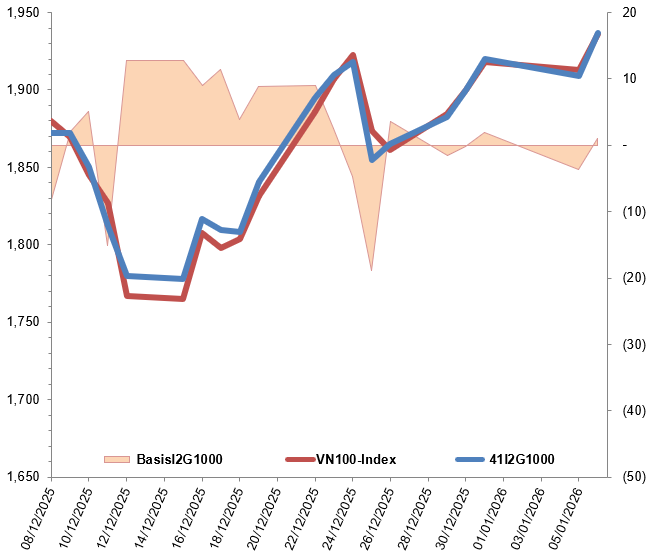 Trong khi đó, basis hợp đồng I2G1000 đảo chiều so với phiên trước đó và đạt giá trị 1.07 điểm. Điều này cho thấy tâm lý nhà đầu tư đã lạc quan trở lại.