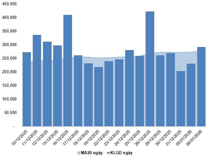 Trong phiên giao dịch ngày 06/01/2026, VN30-Index tăng điểm kèm theo khối lượng giao dịch vượt mức trung bình 20 phiên cho thấy tâm lý lạc quan của nhà đầu tư.