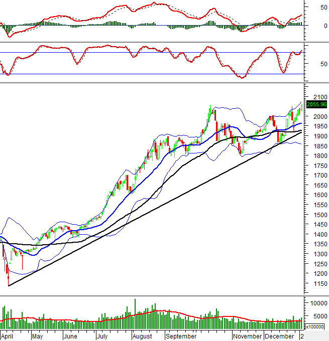 Hiện tại, chỉ số đã lập đỉnh 52 tuần mới trong khi chỉ báo MACD liên tục tạo các đỉnh và đáy mới cao hơn (Higher High, Higher Low). Điều này cho thấy xu hướng tăng ngắn hạn đang được củng cố thêm.
