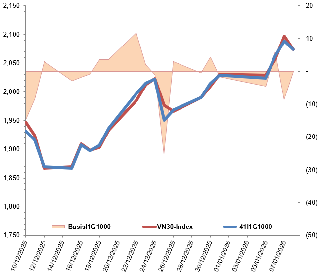 Các hợp đồng tương lai VN30 đồng loạt giảm điểm trong phiên giao dịch ngày 08/01/2026. Cụ thể, 41I1G1000 (I1G1000) giảm 0.68%, còn 2,074 điểm; 41I1G2000 (I1G2000) giảm 0.76%, còn 2,073 điểm; hợp đồng 41I1G3000 (I1G3000) giảm 0.67%, còn 2,074.9 điểm; hợp đồng 41I1G6000 (I1G6000) giảm 0.44%, còn 2,071.5 điểm. Chỉ số cơ sở VN30-Index kết phiên ở mức 2,074.03 điểm.