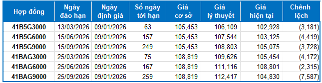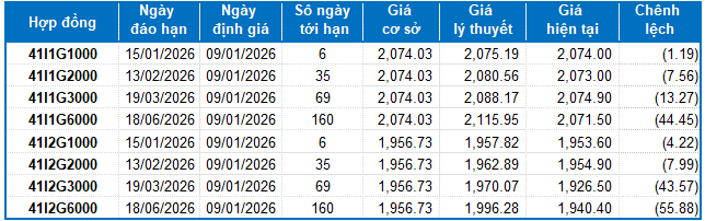Dựa trên phương pháp định giá hợp lý với thời điểm khởi đầu ngày 09/01/2026, khung giá hợp lý của các hợp đồng tương lai đang được giao dịch trên thị trường được thể hiện như sau: