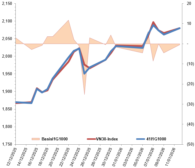 Các hợp đồng tương lai VN30 đồng loạt tăng điểm trong phiên giao dịch ngày 12/01/2026. Cụ thể, 41I1G1000 (I1G1000) tăng 0.88%, đạt 2,079.7 điểm; 41I1G2000 (I1G2000) tăng 0.67%, đạt 2,074.8 điểm; hợp đồng 41I1G3000 (I1G3000) tăng 0.4%, đạt 2,063.4 điểm; hợp đồng 41I1G6000 (I1G6000) tăng 0.52%, đạt 2,070 điểm. Chỉ số cơ sở VN30-Index kết phiên ở mức 2,080.24 điểm.