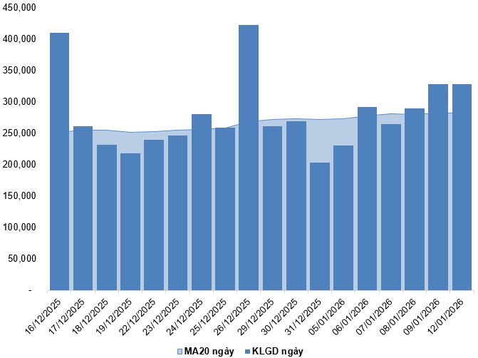 Trong phiên giao dịch ngày 12/01/2026, VN30-Index tăng điểm đồng thời xuất hiện mẫu hình nến thân nhỏ kèm theo khối lượng giao dịch tiếp tục tăng và nằm trên mức trung bình 20 phiên cho thấy tâm lý khá phân vân của nhà đầu tư.
