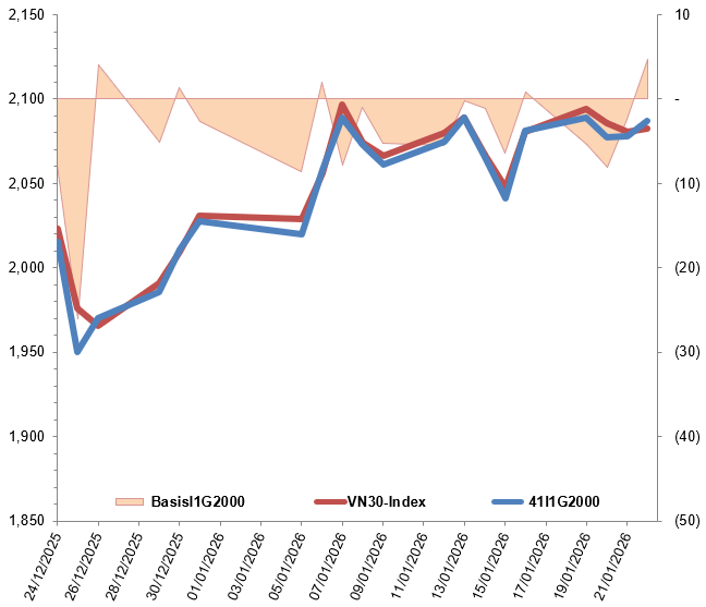 Các hợp đồng tương lai VN30 đồng loạt tăng điểm trong phiên giao dịch ngày 22/01/2026. Cụ thể, 41I1G2000 (I1G2000) tăng 0.43%, đạt 2,087 điểm; 41I1G3000 (I1G3000) tăng 0.19%, đạt 2,077.9 điểm; hợp đồng 41I1G6000 (I1G6000) tăng 0.53%, đạt 2,071 điểm; hợp đồng 41I1G9000 (I1G9000) tăng 0.44%, đạt 2,072 điểm. Chỉ số cơ sở VN30-Index kết phiên ở mức 2,082.35 điểm.