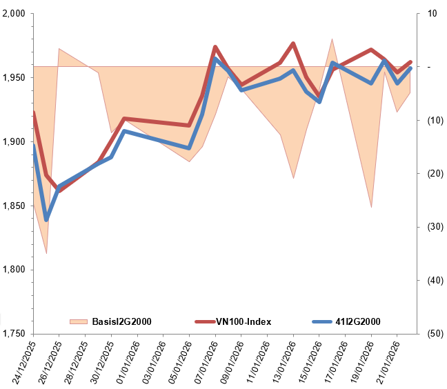 Ngoài ra, các hợp đồng tương lai VN100 đồng loạt tăng điểm trong phiên giao dịch ngày 22/01/2026. Cụ thể, 41I2G2000 (I2G2000) tăng 0.72%, đạt 1,957 điểm; 41I2G3000 (I2G3000) tăng 1.03%, đạt 1,958 điểm; hợp đồng 41I2G6000 (I2G6000) tăng 0.4%, đạt 1,947.1 điểm; hợp đồng 41I2G9000 (I2G9000) tăng 0.98%, đạt 1,946.7 điểm. Chỉ số cơ sở VN100-Index kết phiên ở mức 1,961.84 điểm.