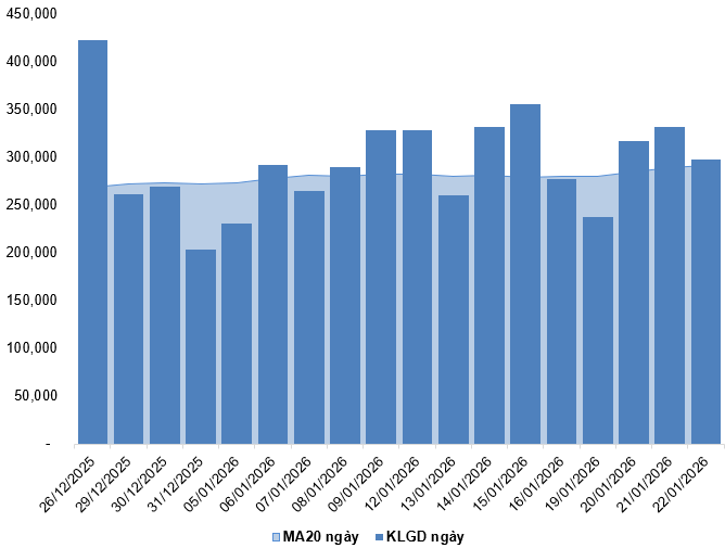 Trong phiên giao dịch ngày 22/01/2026, VN30-Index tiếp tục diễn biến giằng co đồng thời xuất hiện mẫu hình nến thân nhỏ cùng khối lượng giao dịch trong các phiên gần đây có sự trồi sụt thất thường cho thấy tâm lý thiếu ổn định của nhà đầu tư.