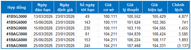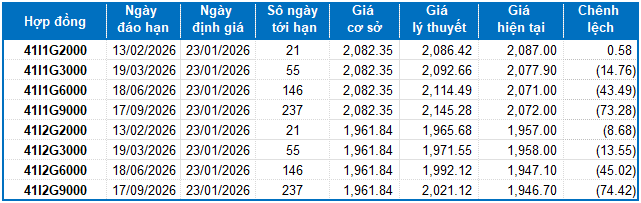 Dựa trên phương pháp định giá hợp lý với thời điểm khởi đầu ngày 23/01/2026, khung giá hợp lý của các hợp đồng tương lai đang được giao dịch trên thị trường được thể hiện như sau: