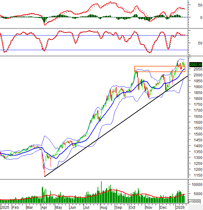 Hiện tại, chỉ số đang kiểm tra lại đỉnh cũ 10/2025 (tương đương vùng 2,022-2,070 điểm) đã bị phá vỡ trước đó trong bối cảnh chỉ báo MACD tiếp tục giảm sau khi cho tín hiệu bán. Điều này cho thấy triển vọng trong ngắn hạn đang dần kém sắc.