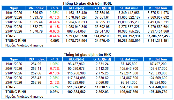 Giao dịch: Các chỉ số chính đồng loạt giảm điểm trong phiên giao dịch ngày 23/01. VN-Index mất 0.63%, lùi về 1,870.79 điểm; HNX-Index cũng giảm mạnh 2.12%, xuống còn 252.96 điểm. Tính chung cả tuần, VN-Index giảm 8.34 điểm (-0.44%), trong khi HNX-Index tăng nhẹ 0.68 điểm (+0.27%).