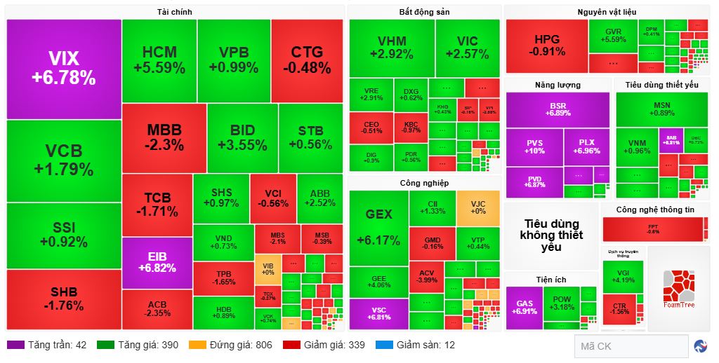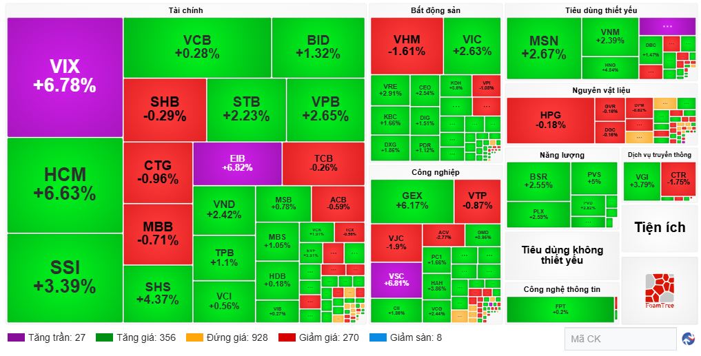 Độ rộng thị trường thể hiện sự thắng thế của phe mua với 430 mã tăng và 350 mã giảm. Thị trường hôm nay có tới 42 mã tăng trần. Bên cạnh họ dầu khí, VIX, EIB, VSC, SAB là các mã tăng trần nổi bật của hôm nay.