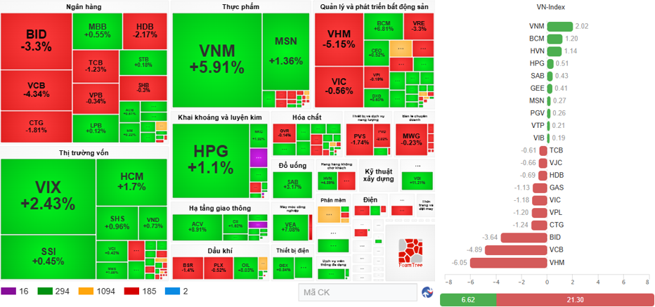 Bất động sản mà đặc biệt là nhóm Vingroup, ngân hàng với điểm nhấn ở khối quốc doanh, dầu khí, chứng khoán là những cái tên tác động lớn, xóa đi nhiều nỗ lực của toàn thị trường, thậm chí trong đó còn có nhiều “ông lớn” như VNM tăng 4.73%, GVR tăng 3.99%, BVH tăng trần…