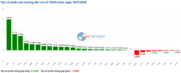 | Top 10 cổ phiếu tác động mạnh tới VN-Index phiên 19/01/2026 (tính theo điểm) | ||