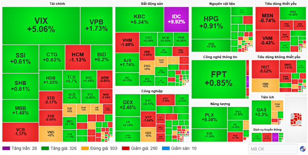 Tất cả các mã cổ phiếu trong rổ VN30 hầu hết đều mang sắc xanh, nổi bật có FPT góp 5.95 điểm, VIC góp 3.11 điểm, HPG góp 2.78 điểm và VPB góp 1.37 điểm vào mức tăng chung của chỉ số. Trái lại, chỉ còn một số ít các mã như MWG, VCB, SAB và VNM vẫn chịu sức ép từ bên bán và lấy đi hơn 1.6 điểm.