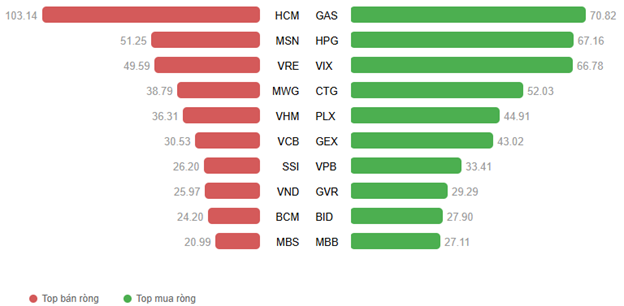 Về giao dịch của khối ngoại, khối này quay lại mua ròng hơn 502 tỷ đồng trên sàn HOSE, tập trung tại các mã GAS (123.62 tỷ), PLX (117.86 tỷ), CTG (117.12 tỷ) và HPG (91.64 tỷ). Trên sàn HNX, khối ngoại bán ròng hơn 7.7 tỷ đồng, tập trung vào mã MBS (23.87 tỷ), TNG (2.41 tỷ), SHS (2.2 tỷ) và PVI (1.46 tỷ).