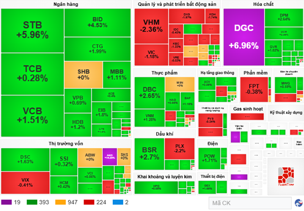 Sắc xanh tiếp tục lan tỏa, dễ thấy nhất là các nhóm ngân hàng, chứng khoán, thực phẩm, hóa chất, dầu khí, hạ tầng, điện. Trong số này, hầu hết đều có chuyển biến theo hướng tích cực hơn, ngoại trừ ngân hàng.