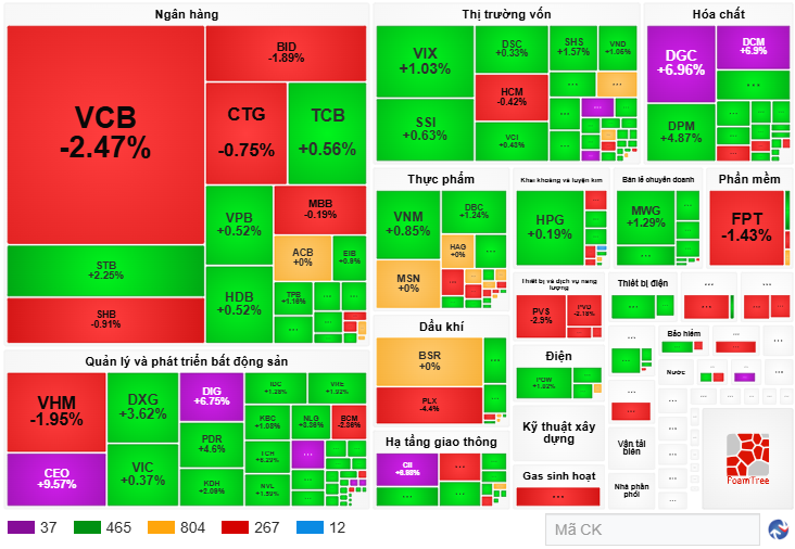 Ngoài ra, sự suy yếu từ hàng loạt cổ phiếu nhóm dầu khí như PLX giảm 3.55%, PVS giảm 2.17%, PVD giảm 1.88%, GAS giảm 4.36%; công nghệ với FPT giảm 0.19%; bán lẻ với MWG giảm 0.23%, PNJ giảm 1.36%, FRT giảm 1.44%; viễn thông như VGI giảm 1.81%, FOX giảm 3.47%, CTR giảm 0.49%... cũng tạo thêm sức ép.