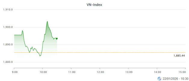 Tính đến 10h30, VN-Index tăng 8.1 điểm lên 1,893.54, trong khi HNX-Index tăng 0.69 điểm lên 253.35 và UPCoM-Index tăng 1.04 điểm lên 126.97.