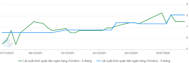 Diễn biến lãi suất liên ngân hàng kỳ hạn từ tháng 12/2025 đến đầu 2026. Đvt: %/năm