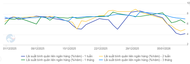 Trên thị trường liên ngân hàng, lãi suất tuần đầu năm 2026 hạ nhiệt rõ rệt ở hầu hết các kỳ hạn. Lãi suất qua đêm bật tăng lên 6.88% trong phiên đầu tiên của năm trước khi giảm mạnh về 3.16% vào cuối tuần.