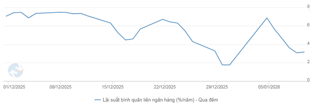 Diễn biến lãi suất liên ngân hàng kỳ hạn qua đêm từ tháng 12/2025 đến đầu 2026. Đvt: %/năm