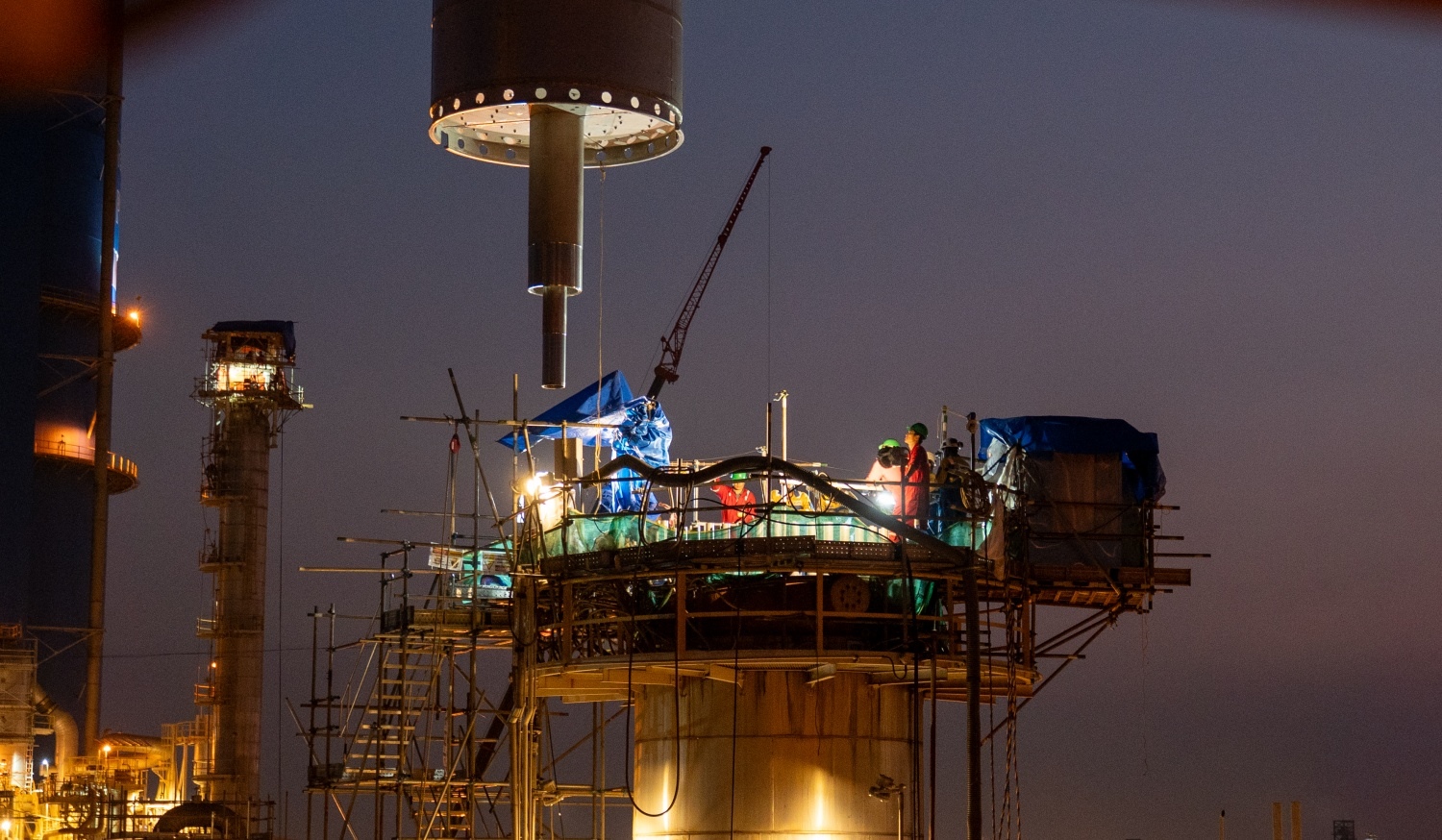 Rọ xúc tác nặng khoảng 86 tấn được cẩu nhấc từ từ, di chuyển sang vị trí vỏ thiết bị để cân chỉnh và lắp đặt.