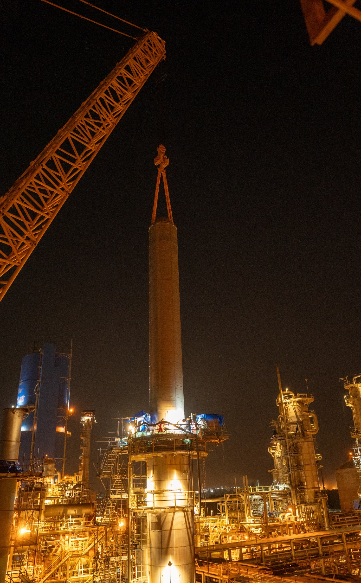 Để phục vụ công tác thay rọ xúc tác, Nhà máy Đạm Phú Mỹ đã huy động hai cần cẩu có sức nâng 1.250 tấn và 225 tấn, phối hợp nâng hạ các cấu kiện có trọng lượng lên tới 105 tấn. Tùy từng vị trí và cao độ thi công, hai cần cẩu được tính toán, phân tải và phối hợp linh hoạt nhằm bảo đảm an toàn và chính xác trong suốt quá trình lắp đặt.