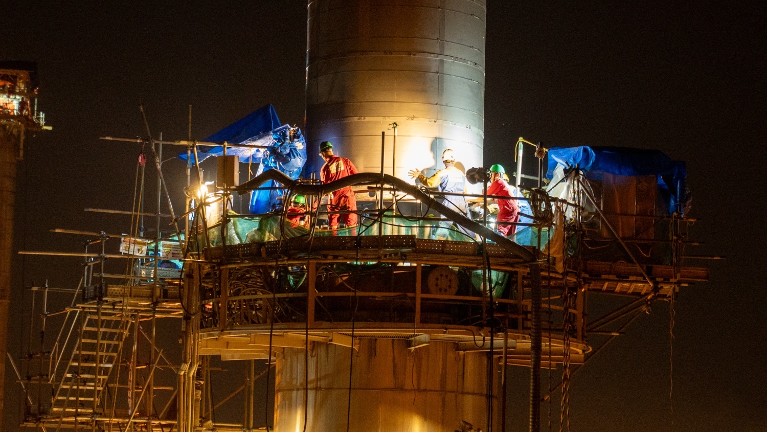 Anh Hoàng Tuấn Minh (áo xám) - Quản đốc Xưởng Amoniac (Nhà máy Đạm Phú Mỹ), cho biết rọ xúc tác sẽ được cẩu đưa từ vỏ chứa vào vỏ thiết bị để lắp đặt thử, qua đó thu thập các thông tin về khe hở giữa đáy rọ và giá đỡ bên trong vỏ thiết bị. Sau đó, rọ được nhấc lên lại để hàn các tấm chèn, bảo đảm khe hở đồng đều giữa đáy rọ và giá đỡ, giúp rọ đạt độ thẳng đứng và đồng tâm theo yêu cầu kỹ thuật.