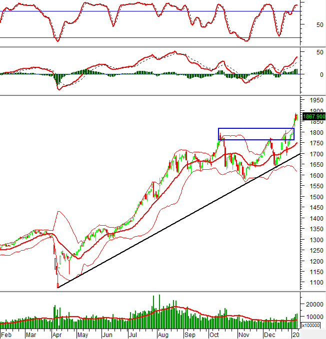 Tuy nhiên, VN-Index đã lập đỉnh 52 tuần mới và tiếp tục bám sát dải trên (Upper Band) của Bollinger Bands cho thấy triển vọng tích cực vẫn đang hiện hữu.