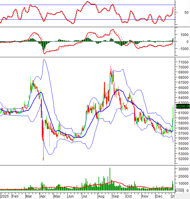Hiện tại, VCB tiếp tục tăng và dải Bollinger Bands vẫn đang mở rộng trong khi chỉ báo Stochastic Oscillator tiếp tục tăng sau khi cho tín hiệu mua. Nếu tín hiệu tích cực này tiếp tục duy trì thì xu hướng phục hồi sẽ bền vững hơn.