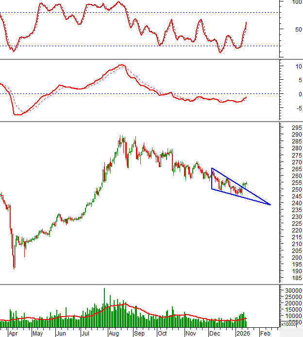 Chỉ số tiếp tục duy trì bên trên cạnh của mẫu hình Falling Wedge nên rủi ro không lớn. Mục tiêu giá (target price) của mẫu hình này là vùng 266-268 điểm.