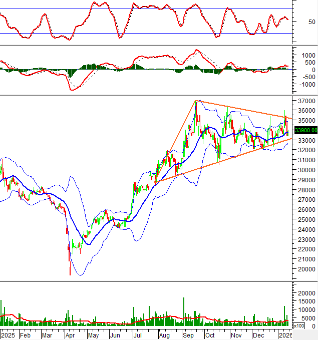 Hiện tại, giá của DHC biến động gần cạnh dưới (tương đương vùng 32,400-33,500) của mẫu hình giá Triangle trong bối cảnh chỉ báo MACD dần thu hẹp khoảng cách với đường Signal.