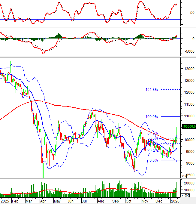 Hiện tại, giá cổ phiếu này tiếp tục bám sát dải trên (Upper Band) của Bollinger Bands trong khi chỉ báo MACD tiếp tục tăng sau khi cho tín hiệu mua.