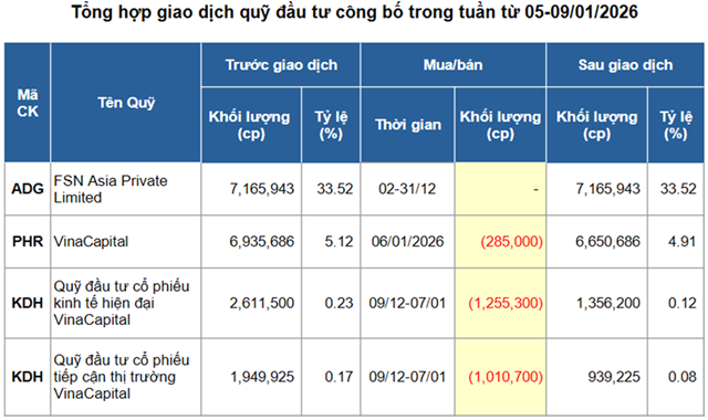 Ngày 08/01, 2 thành viên khác thuộc VinaCapital cũng báo cáo kết quả thoái vốn tại CTCP Đầu tư và Kinh doanh Nhà Khang Điền (KDH) nhằm tái cơ cấu danh mục, với thời gian thực hiện từ 09/12/2025 đến 07/01/2026.