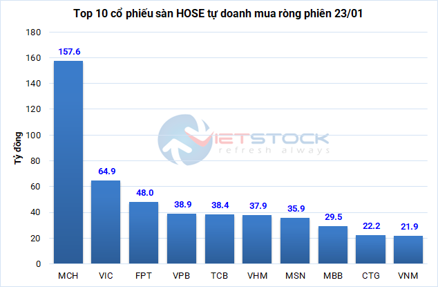 Ở chiều mua, điểm sáng hiếm hoi đến từ MCH khi được tự doanh gom ròng tới 158 tỷ đồng, vượt xa VIC ở vị trí kế tiếp với 65 tỷ đồng và FPT với 48 tỷ đồng.