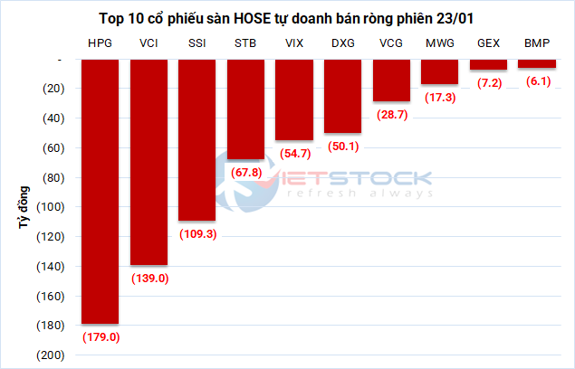 Ngược chiều với khối ngoại, tự doanh có phiên bán ròng nhẹ gần 42 tỷ đồng trên HOSE. Đáng chú ý, lực bán tập trung mạnh vào HPG với 179 tỷ đồng, áp đảo phần còn lại. Nhóm cổ phiếu chứng khoán cũng chịu áp lực xả lớn khi VCI và SSI lần lượt bị bán ròng 139 tỷ đồng và 109 tỷ đồng; VIX cũng góp mặt trong top 10 mã bị bán ròng mạnh nhất.