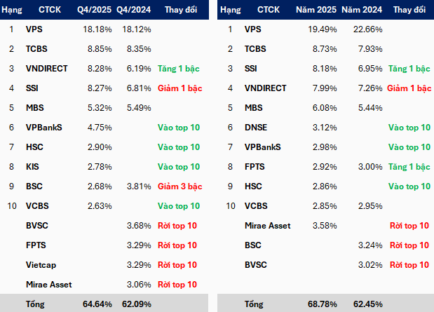 Trên bảng xếp hạng thị phần, Chứng khoán VPS và Chứng khoán Kỹ Thương (TCBS) tiếp tục giữ hai vị trí đầu tiên. Trong đó, VPS tạo khoảng cách so với các công ty khác, với thị phần 18.18% trong quý 4/2025 và 19.49% cả năm 2025.