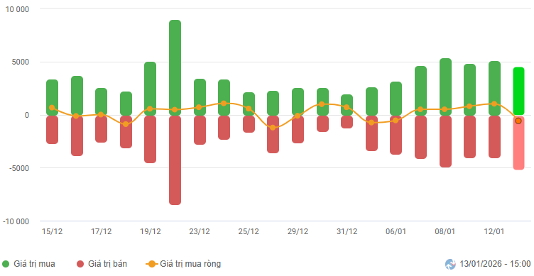 Biến động của dòng tiền từ khối ngoại: Khối ngoại quay lại bán ròng trong phiên giao dịch ngày 13/01/2026. Nếu nhà đầu tư nước ngoài duy trì hành động này trong những phiên tới thì tình trạng rung lắc có thể xuất hiện.