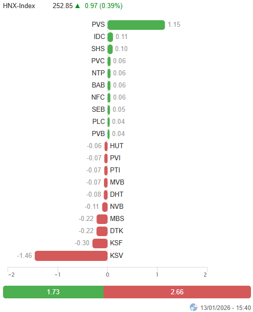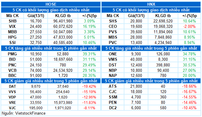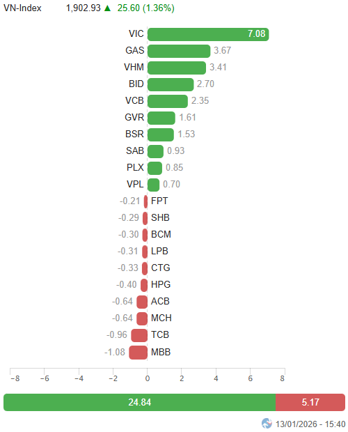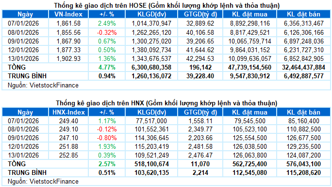 - Thị trường tiếp tục duy trì đà tăng tích cực trong phiên giao dịch ngày 13/01. Nhóm cổ phiếu trụ luân phiên giữ vai trò dẫn dắt giúp VN-Index duy trì nhịp tăng ổn định trong suốt phiên, dù độ rộng thị trường phân hóa rõ hơn khi áp lực chốt lời có phần gia tăng ở các cổ phiếu đã tăng mạnh gần đây. Chỉ số từng bước nới rộng biên độ tăng và chinh phục thành công mốc 1,900 điểm, qua đó xác lập cột mốc lịch sử mới. Kết phiên, VN-Index đóng cửa tại 1,902.93 điểm, tăng 1.36% so với phiên trước.