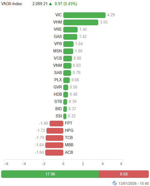 - VN30-Index đóng cửa tăng gần 9 điểm (+0.43%), lên mức 2,089.21 điểm. Độ rộng của rổ khá cân bằng với 15 mã tăng, 13 mã giảm và 2 mã đứng giá. Trong đó, PLX, GAS và SAB là những điểm sáng nổi bật nhất với sắc tím rực rỡ, cùng với GVR và BID cũng ghi nhận mức tăng tích cực, lần lượt là 5.6% và 3.6%. Ở chiều ngược lại, ACB và MBB chịu áp lực bán mạnh nhất, xếp cuối bảng với mức giảm trên 2%.