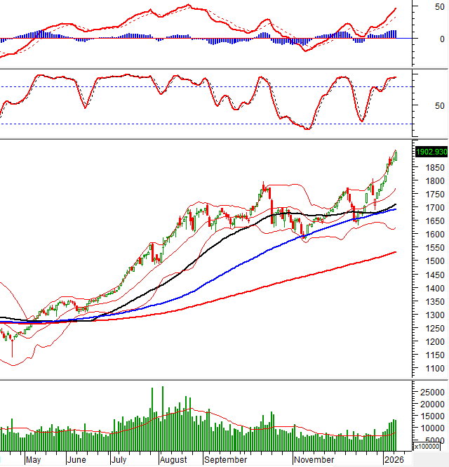 VN-Index bứt phá mạnh mẽ qua mốc 1,900 điểm, thiết lập đỉnh cao mới trong bối cảnh thanh khoản duy trì trên mức trung bình 20 ngày. Triển vọng ngắn hạn tiếp tục được củng cố khi chỉ số bám sát Upper Band của Bollinger Bands và MACD liên tục nới rộng khoảng cách với đường Signal. Dù vậy, Stochastic Oscillator có dấu hiệu suy yếu trong vùng quá mua nên nhà đầu tư cần lưu ý rủi ro rung lắc kỹ thuật có thể xuất hiện trong các phiên tới.