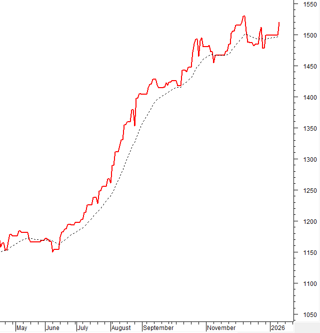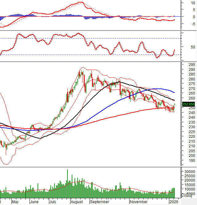 Triển vọng ngắn hạn tiếp tục được củng cố khi chỉ số bám sát Upper Band của Bollinger Bands và MACD liên tục nới rộng khoảng cách với đường Signal. Dù vậy, Stochastic Oscillator có dấu hiệu suy yếu trong vùng quá mua (overbought), nhà đầu tư cần lưu ý rủi ro rung lắc nếu tín hiệu bán xuất hiện trong những phiên tới.
