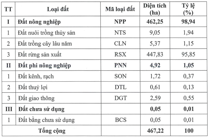 Hiện trạng khu đất dự án phần lớn là đất nông nghiệp có diện tích hơn 462ha, chiếm gần 99%. Đất phi nông nghiệp khoảng 4.9ha, chiếm hơn 1%.