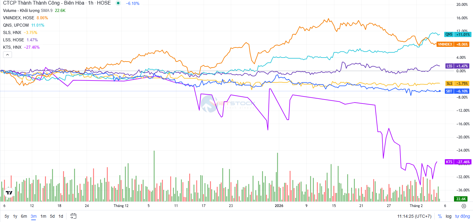 Ngay cả LSS, dù lợi nhuận tăng, giá cổ phiếu cũng chỉ đi ngang, phản ánh sự hoài nghi của nhà đầu tư về tính bền vững. Dù vậy, trong dài hạn 1 năm, thị giá SBT vẫn tăng 76.3%, vượt xa mức sinh lời 40.2% của VN-Index.